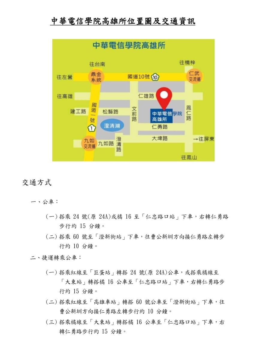 高雄市仁武區仁勇路400號1樓(中華電信學院高雄所綜合大樓1樓 3102教室)
