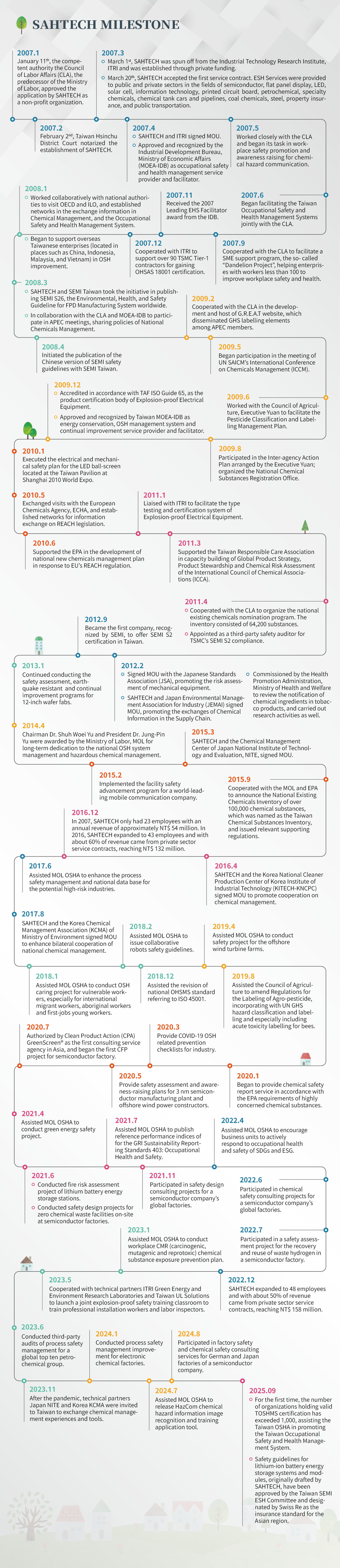 SAHTECH also plays a major role in amendment and promotion of SHE policies and regulations such as OSH on Vision Zero, chemical occupational health management, process safety management, industry 4.0 safety, Taiwan Occupational Safety and Health Management system, OSH on SDGs and Carbon Net-Zero. In addition, SAHTECH provides technical services to various industries, available services including chemical safety report, fire protection, exposure assessment, mechanical and electrical safety.